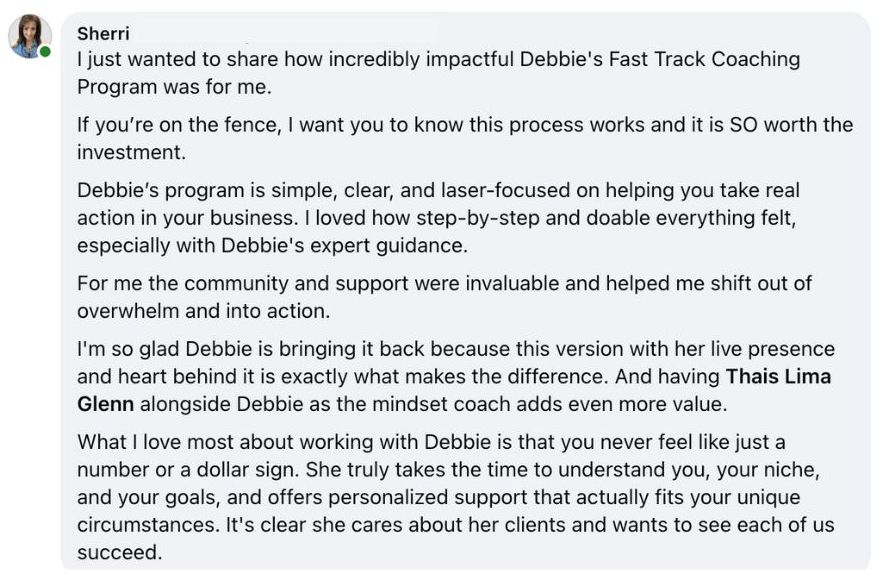 "Debbie’s program is simple, clear, and laser-focused on helping you take real action in your coaching business."